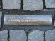 August Bebel Gedenktafel über Hauseingang Kasemattenstr. 8 in Köln Deutz. Bebel ist straff nach vorne aufgerichtet am Rednerpult zu sehen, er war ein sehr guter charismatischer, mitreissender Redner. Die Kasematten unter der Festung Deutz waren dunkle Gänge, im Vergleich dazu ist ein heutiger Knast ein Palast.
